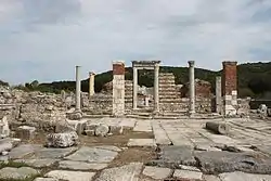 Dans l’Antiquité tardive, la stoa sud de l’Olympiéion qui servait au culte impérial depuis l’époque d’Hadrien[2], et servait d’entrée monumentale au téménos[3] est progressivement convertie pour l’usage de la communauté chrétienne, dont elle devient l’église cathédrale et le palais épiscopal. L’église est en effet identifiée avec certitude à l’église de Marie dans laquelle se déroulèrent les débats des deux conciles de 431 et 449, grâce à une inscription de l’évêque Hypatius dans le narthex[4]. La chronologie des différentes phases de construction chrétienne dans cet ensemble a été renouvelée par les travaux récents[5].
