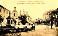 Vue datant de la première moitié du XXe siècle ; le beffroi d'origine est encore présent. Photographie d'Adam Lenkiewicz.