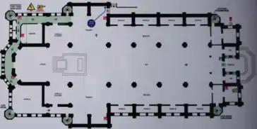 La nef, haute de vingt-et-un mètres sous la clé, son point le plus élevé, est voûtée d'ogives quadripartites, lui donnant ainsi une allure ample et dégagée. Elle est séparée des collatéraux par des piliers reposant sur un haut piédestal, dont la base est composée de deux types de moulures différentes : un tore et une scotie. Avec leurs pilastres (dotés de chapiteaux étonnants, ornés sur une seule face de palmettes et de pirouettes) de faible saillie, ces piliers donnent ainsi l'illusion de colonnettes engagées. Les dosserets se prolongent de façon classique jusqu'à la naissance des arcs doubleaux de la nef, et sont renforcés à l'étage par des colonnes adossées, qui présentent des chapiteaux corinthiens stylisés. Ces colonnes ont également comme particularité d'être dotées d'une base large et d'une décoration de fleur à six pétales, motif récurrent, et de s'élancer vers le haut en deux disques accolés[1].