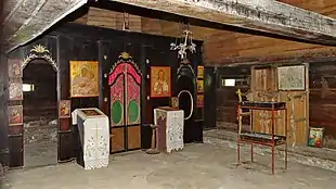 L'église est très sombre car elle est éclairée seulement par quelques petites fenêtres horizontales, dotées de volets en bois que l'on tire de l'intérieur par des guides[3]. On y trouve du mobilier en bois, dont deux chandeliers, l'un haut de 1,70 m, l'autre haut de 1,90 m, ainsi qu'un lustre en tilleul constitué de huit unités ornementales différentes[3],[1]. Toutes ces pièces sont l'œuvre des maîtres de l'Osat[3].