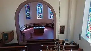 Les vitraux, de Ernest Werle[8], sont figuratifs dans le chœur et symboliques dans la nef[9].