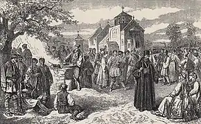 Pendant la grande guerre turque (1683–1699), la plupart de la Hongrie est libérée des Ottomans et les éparchies (diocèses) de ces terres passent sous la domination des Habsbourgs. En 1689, le patriarche serbe Arsenije III (Arsène III), qui s'était rangé du côté des Autrichiens, quitte le monastère patriarcal de Peć pour rejoindre Belgrade en 1690, conduisant ainsi la première grande migration des Serbes. À cette époque, un grand nombre de Serbes s’installent dans les parties méridionales et centrales de la Hongrie[2]. D'importants privilèges leur sont alors accordés par l'empereur Léopold Ier[3], leur permettant de conserver leur foi orthodoxe et l'organisation de leur Église dirigée par un archevêque et des évêques. Au cours des deux siècles suivants d'existence autonome, l'Église serbe sous la monarchie des Habsbourg conserve toujours une organisation fondée sur ces privilèges originels reçus de l'empereur[4].