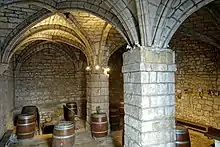 - Albert Fossard fait certainement erreur on y voyant les vestiges d'une simple galerie de circulation. Il mentionne implicitement ces baies : « D'une salle qui, primitivement n'était pas en sous-sol, appelée de nos jours salle capitulaire, on allait à l'église par une galerie encore apparente, quoique effondrée, et montant par des paliers que suivent les décrochements des fenêtres ; les chambranles de celles-ci se voient parfaitement à l'extérieur, dans la partie du mur vers la rivière » (1934, op. cit., p. 75).