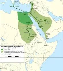 En 1821, Ibrahim Pacha fit construire le bourg de Khartoum, qui deviendra plus tard la capitale du Soudan. La même année, Méhémet Ali envoya le général Mahommed Bey, avec environ 4 500 soldats et 8 canons envahir le pays de Kordofan au centre de l'actuel Soudan. Mahommed Bey réussit la conquête après une guerre terrible.