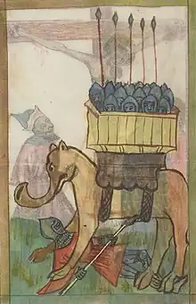 Les éléphants d'Asie alignés par Pyrrhus Ier portaient selon les auteurs romains une tour sur le dos[20]. Les éléphants employés par les Carthaginois étaient de l'espèce des forêts, plus petits que leurs cousins d'Inde, n'étaient pas selon Serge Lancel[21], assez forts pour transporter une tour et étaient chevauchés seulement par deux ou trois hommes, plus le conducteur de l'animal qui était généralement numide[18].