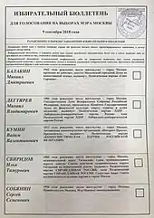 - Yevgeny Budnik, membre de l'assemblée du district de Basmanny, comme candidat indépendant[8] ;