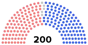 | Total sièges | 6 | 4 | 88 | 65 | 16 | 21 | 200 | ||