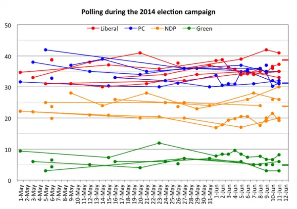 - : Jour du scrutin. Les résultats préliminaires annoncent un gouvernement majoritaire libéral de 59 députés (ultérieurement rectifié), dirigé par la Première ministre sortante Kathleen Wynne. Les progressistes-conservateurs demeurent l'Opposition officielle, avec 27 sièges (ultérieurement rectifié), et le NPD garde son nombre de députés à 21. Le chef progressiste-conservateur Tim Hudak annonce sa démission à titre de chef du Parti lors de son discours de défaite, mais il demeure député de sa circonscription de Niagara-Ouest—Glanbrook.