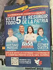 La campagne de Luisa González se focalise essentiellement sur son image d'héritière de Rafael Correa, le style de gouvernement de l'ancien président étant mis en avant et associé à une gestion efficace, à la sécurité, au soutien au monde rural et en particulier indigène, ainsi qu'aux grands travaux publics[45]. La candidate se présente en grande partie comme celle qui permettra au dirigeant en exil de revenir au pays, promettant d'en faire son principal conseiller[40]. Elle affirme néanmoins ne pas avoir l'intention de lui accorder de grâce, celui-ci refusant cette option afin que son procès soit résolu « dans la stricte légalité et dans la justice ». Le bilan du président sortant Guillermo Lasso est au contraire fortement critiqué par la candidate, au point de paraître comme son principal adversaire malgré son absence du scrutin, chaque élément de son bilan étant comparé négativement à celui de Correa sous les slogans « Nous serons à nouveau une patrie » (Volveremos a ser Patria) et « La résurgence de la patrie » (El Resurgir de la Patria)[46]. En réponse aux critiques d'adversaires la désignant comme une « candidate mouton », elle fait de l'animal un symbole de campagne, distribuant des peluches et utilisant dans ses spots de campagne des moutons munis de lunettes de soleil faits par intelligence artificielle[38].