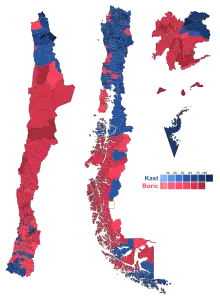Gabriel Boric l'emporte avec 55,87 % des suffrages exprimés lors du second tour, qui connait une hausse notable du taux de participation : 55,64 %, contre 47,33 % au premier tour. Il s'agit de la participation la plus élevée depuis la fin du vote obligatoire en 2012[47]. La hausse de la participation des classes populaires et des jeunes semble avoir permis à Gabriel Boric de déjouer les sondages, qui le donnaient au coude-à-coude avec Kast[48]. Il devient ainsi à 35 ans le plus jeune président de l'histoire du Chili[49]. Lors de son discours de victoire, il assure que le pays bénéficiera de davantage de droits sociaux tout en restant fiscalement responsable. À l'annonce de sa victoire, la capitale Santiago ainsi que de nombreuses villes du pays connaissent des scènes de liesses jusque tard dans la nuit[50].