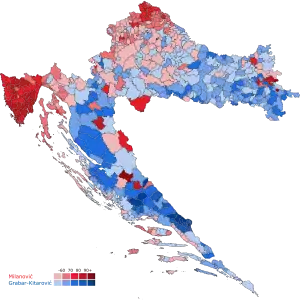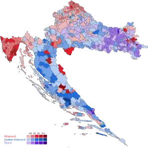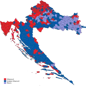À l'issue du premier tour, marqué par une faible participation — bien qu'en hausse —, l'ancien Premier ministre social-démocrate Zoran Milanović vire en tête, devant la cheffe de l'État : tous deux se qualifient pour le second tour, deux semaines plus tard. La droite radicale réalise une percée à l'occasion de ce scrutin, le national-populiste Miroslav Škoro talonnant la présidente sortante avec près d'un quart des suffrages exprimés. Milanović l'emporte deux semaines plus tard avec 52,7 % des suffrages exprimés et 55 % de participation, en baisse sensible par rapport à l’élection précédente.