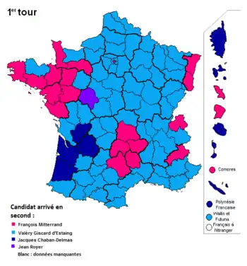 Le premier tour est marqué par l'opposition entre l'ancien Premier ministre gaulliste Jacques Chaban-Delmas, le ministre des Finances, Valéry Giscard d'Estaing, et le premier secrétaire du Parti socialiste et candidat de l'union de la gauche, François Mitterrand.