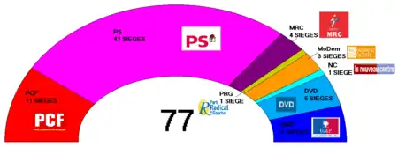 | Parti socialiste | PS | 49 | 24 | 80 613 | 31,52 | 95 402 | 41,08 | 22 | 47 | ||