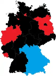 Parti arrivé en tête par Land. Rouge : SPD, Noir : CDU, Bleu : CSU
