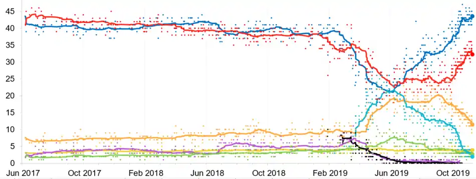 Le , Johnson propose des législatives anticipées pour le . Les travaillistes conditionnent cela à l'assurance qu'il n'y aura pas de Brexit sans accord[55]. Le , la Chambre des communes rejette une telle proposition[56]. Le lendemain, alors que Johnson propose de modifier la loi électorale pour fixer la date des élections au (ce qui nécessite une majorité simple), les travaillistes se disent prêts à approuver cette demande, avec cependant la possibilité de différer la date du scrutin[57]. En effet, Johnson s'est engagé à ne pas sortir le pays de l'Union européenne, ni à faire voter le Parlement au sujet de l'accord, avant les prochaines élections[58]. Ceux-ci tentent sans succès de fixer la date du scrutin au , arguant que cela permettrait aux étudiants de voter avant de partir en vacances auprès de leurs parents[59]. Afin de favoriser le vote de son projet de loi, Johnson rétablit dans le parti dix des vingt et un députés exclus le . La dissolution a par conséquent lieu par le biais du vote d'une loi distincte, soumise au processus parlementaire ordinaire, par laquelle la Chambre modifie simplement la date de fin de sa législature en l'avançant du au , par 438 voix pour et 20 contre le . Le lendemain, la chambre des Lords approuve la loi, qui reçoit la sanction royale le [60].