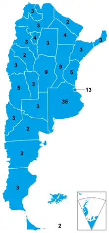 La Chambre des députés (Cámara de Diputados) est dotée de 257 sièges pourvus pour des mandats de quatre ans renouvelés par moitié tous les deux ans. Le système électoral mis en œuvre est celui du scrutin proportionnel plurinominal à la plus forte moyenne, selon la méthode d'Hondt dans 24 circonscriptions électorales plurinominales correspondants aux vingt-trois provinces de l'Argentine plus Buenos Aires. Le nombre de sièges par circonscription varie selon leur population. Un Seuil électoral de 4 % des suffrages exprimés au niveau national est requis pour que les listes de candidats puissent se voir attribuer des sièges[6].
