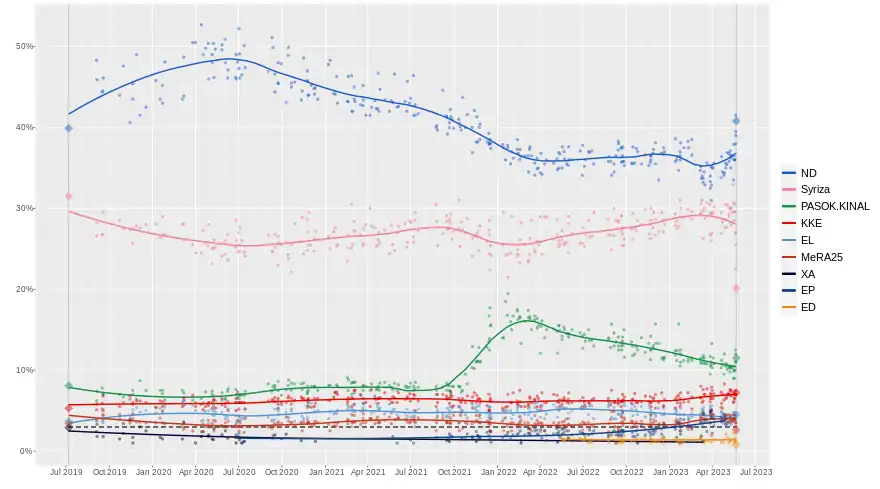 Avec un peu plus de 40 % des suffrages exprimés, Nouvelle Démocratie (ND) frôle la majorité absolue des sièges. Le parti du Premier ministre réunit ainsi plus du double des suffrages de SYRIZA, arrivé deuxième devant le PASOK - Mouvement pour le changement (PASOK-KINAL) et le Parti communiste de Grèce (KKE). Solution grecque (EL) progresse légèrement, tandis que le Front de désobéissance réaliste européen (MeRA25) échoue à franchir le seuil électoral de 3 % et perd toute représentation au Parlement. Bénéficiant de la mise hors la loi d'une large part de l’extrême droite, le Mouvement démocrate patriote - Victoire (NIKH) frôle les 3 % sans pour autant les franchir[32],[33],[34].