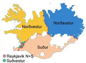 L'Islande est divisée en 6 circonscriptions électorales dont les limites sont définies par la loi : Norðausturkjördæmi (Nord-Est), Norðvesturkjördæmi (Nord-Ouest), Reykjavíkurkjördæmi norður (Reykjavik Nord), Reykjavíkurkjördæmi suður (Reykjavik Sud), Suðurkjördæmi (Sud) et Suðvesturkjördæmi (Sud-Ouest).