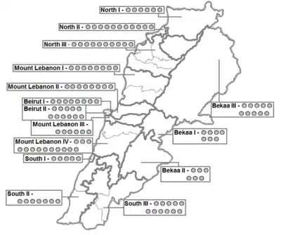En accord avec la pratique libanaise du confessionnalisme politique, les communautés religieuses libanaises se répartissent des sièges réservés dans les différentes circonscription suivant leur poids démographique. La répartition des voix se fait à la proportionnelle. Une fois l'ensemble des bulletins de vote dépouillés, le total des votes valides dans chaque circonscription est divisé par le nombre de sièges à pourvoir, ce qui donne en voix le seuil électoral nécessaire pour qu'une liste obtienne un siège. La répartition des sièges se fait entre les listes ayant atteint ce quorum de manière proportionnelle selon le pourcentage de voix obtenu, puis au sein des listes en accord avec les quotas confessionnels et le nombre de votes préférentiels obtenus par les candidats[1].