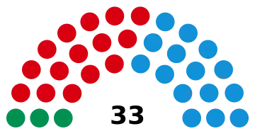 | 33 conseillers municipaux (majorité absolue : 17 conseillers municipaux) | ||||||||||||||