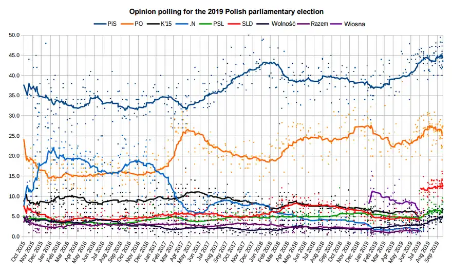 Au moment des élections législatives de 2019, la situation économique de la Pologne est parmi l'une des meilleures en Europe : la croissance atteint 5 % (contre environ 1,5 % pour les pays de l’Union européenne), le chômage est à 3,8 % (le taux le plus bas depuis la fin du communisme), le déficit public est stabilisé à 1,6 % du PIB et la dette publique demeure sous les 50 % du PIB. Pour freiner l’émigration et relancer la natalité, le gouvernement sortant a exonéré d'impôt les travailleurs de moins de 26 ans et augmenté les allocations familiales[3].