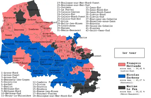 Dans le Pas-de-Calais, Marine Le Pen arrive en tête du premier tour avec 34,35 % des exprimés, suivie de Jean-Luc Mélenchon (19,13 %), Emmanuel Macron (18,45 %), François Fillon (14,29 %) et Benoît Hamon (5,17 %). Au second tour, les électeurs ont voté à 52,06 % pour Marine Le Pen contre 47,94 % pour Emmanuel Macron avec un taux de participation de 75,95 % des inscrits[13].