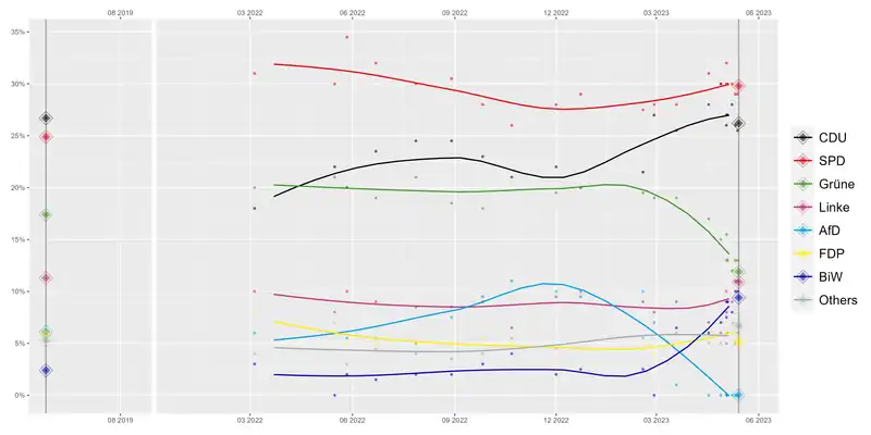 | Institut | Date | CDU | SPD | Grünen | FDP | Linke | AfD | BiW |