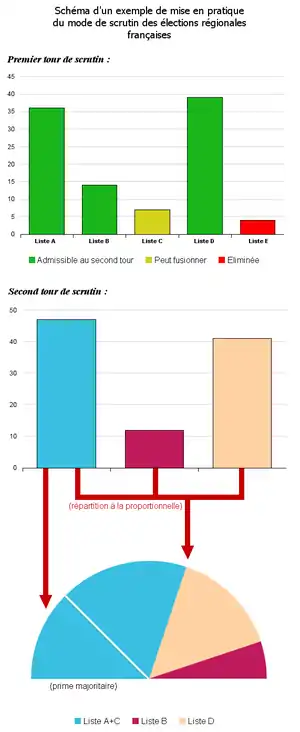 Si aucune liste n'a recueilli la majorité absolue, un second tour est organisé entre toutes les listes ayant obtenu au moins 10 % des suffrages exprimés au premier tour (7 % en Corse[12]). Les listes ayant obtenu au moins 5 % peuvent néanmoins fusionner avec les listes pouvant se maintenir. La répartition des sièges se fait selon les mêmes règles qu'au premier tour, la seule différence étant que la prime majoritaire est attribuée à la liste arrivée en tête, qu'elle ait obtenu ou non la majorité absolue[11].
