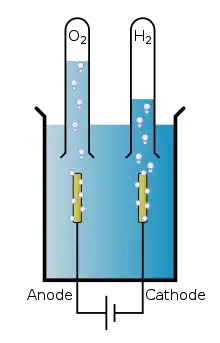 L'électrolyse peut être utilisée pour décomposer l'eau (H2O) en dihydrogène (H2) et en dioxygène (O2).