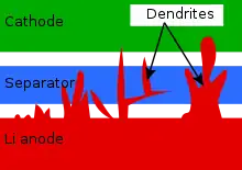 La polyvalence et les propriétés des électrolytes solides permettent d'envisager des applications ayant une densité massique d'énergie élevée avec des accumulateurs moins chers que l'état de l'art actuel des accumulateurs lithium-ion ne permet pas d'atteindre. En effet, en introduisant un électrolyte solide dans l'architecture des accumulateurs, il est possible d'utiliser du lithium métallique comme matériau d'anode, avec la possibilité d'obtenir une batterie à haute densité d'énergie grâce à sa capacité spécifique élevée de 3 860 mAh/g[66]. L'utilisation d'une anode au lithium métallique (LMA) est rendue impossible dans un électrolyte liquide essentiellement en raison de la croissance dendritique des électrodes en lithium pur susceptible de provoquer des courts-circuits après quelques cycles de charge ; l'augmentation de volume, la réactivité de l'interface électrolyte-solide (SEI) et le lithium « mort » sont d'autres problèmes posés par cette technologie[67]. L'utilisation d'un électrolyte solide permet en revanche un contact homogène avec l'électrode de lithium métallique et présente les propriétés mécaniques empêchant le dépôt incontrôlé de cations de lithium Li+ pendant la phase de charge. Les électrolytes solides ont également des applications potentielles dans les accumulateurs lithium-soufre en résolvant le problème clé de l'effet « navette » polysulfure en bloquant la dissolution des espèces polysulfure dans l'électrolyte qui réduit rapidement la capacité[68].