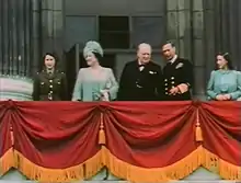 La princesse Élisabeth (à gauche) sur le balcon du palais de Buckingham avec, de gauche à droite, sa mère Élisabeth, le Premier ministre britannique Winston Churchill, le roi George VI et la princesse Margaret, le .