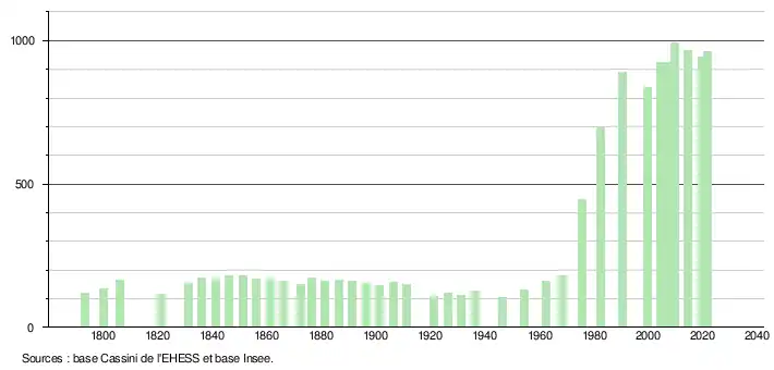 L'évolution du nombre d'habitants est connue à travers les recensements de la population effectués dans la commune depuis 1793. Pour les communes de moins de 10 000 habitants, une enquête de recensement portant sur toute la population est réalisée tous les cinq ans, les populations légales des années intermédiaires étant quant à elles estimées par interpolation ou extrapolation[20]. Pour la commune, le premier recensement exhaustif entrant dans le cadre du nouveau dispositif a été réalisé en 2004[21].