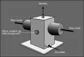Sous son aspect industriel pour la marine, l’arc est soufflé par un électroaimant « M », ceci dans le but de l’allonger pour obtenir une meilleure stabilité ; la cathode (–) est en carbone, l’anode (+) en cuivre et refroidie par une circulation d’eau ; l’arc jaillit dans une atmosphère de vapeur d’alcool ; la tension appliquée est de l’ordre de 600 volts, la fréquence obtenue de 500 kHz, avec une puissance de l’ordre de plusieurs kilowatts.