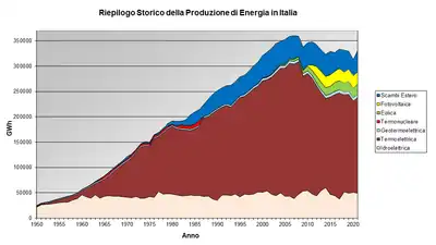 - (it) Cet article est partiellement ou en totalité issu de l’article de Wikipédia en italien intitulé « Produzione di energia elettrica in Italia » (voir la liste des auteurs).