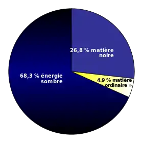 Malgré une densité très faible[alpha 1] (de l'ordre de 10−29 g/cm3)[alpha 2], l'énergie sombre serait une composante majeure de l'Univers, représentant environ 68 % de la densité d'énergie totale de l'Univers.