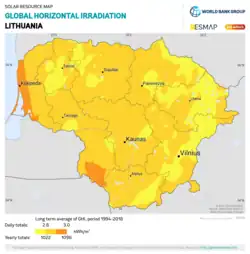 En 2022, la Lituanie disposait d’une capacité de 568 MWc de production d'énergie solaire (contre seulement 2,4 MWc en 2010)[7],[8].