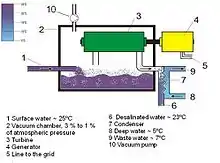 Le cycle commence par le pompage de l’eau de mer de surface qui se trouve dans les environs de 26 °C. On l’introduit dans un évaporateur qui sera mis sous vide, pour favoriser l’effet d’évaporation, car sous pression relative négative, l’évaporation se produit à plus faible température et la vapeur est débarrassée du sel, mais sur le débit d’eau qui traverse l’évaporateur, seulement 0,5 % de vapeur d’eau est produite, le reste de l’eau est rendu à la mer à 21 °C. La faible pression produite par la vapeur suffit à entraîner un turbogénérateur qui produira de l’électricité. Puis, la vapeur est transférée dans le condenseur à double paroi, qui avec l’eau froide pompée en profondeur vers les 5 °C, va faire condenser la vapeur en eau douce qui pourra être utilisée à la consommation.