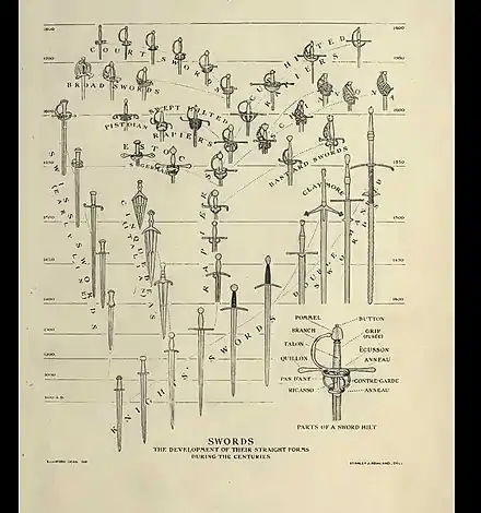 - épée de cour : une version plus courte de la précédent, prolongeant la tendance d'une arme de moins en moins utilitaire ;