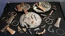 Objets étrusques retrouvés dans l'épave de Rochelongue. Ils comprennent notamment des bijoux tels que des bracelets, et des restes d'outils, notamment des fers de haches. Musée de l'Éphèbe, Agde (France).