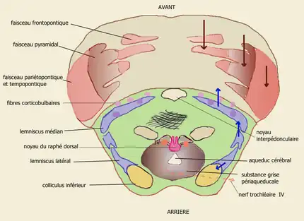 En outre, le processus de signalisation inverse des éphrines B et des EphB induit un phénomène de rétractation au sein du faisceau intrapyramidal[35]. En outre, des observations ont montré que la molécule Ephrin-B3 (en) transforme des signaux inverses dépendant de la phosphorylation de la tyrosine en axones de l'hippocampe qui déclenchent l'élagage des fibres du faisceau intrapyramidal excessives[35],[36]. Ces éléments tendent à déterminer que les récepteurs EphB, qui s'expriment à la surface des cellules cibles, engendrerait la phosphorylation du domaine tyrosine de l'éphrine B3[35],[36]. L'interaction entre l'éphrine B3 et la protéine adaptatrice de type cytoplasmique NCK2 génère le recrutement et le couplage de la protéine Dock « 180 » avec les domaines actifs kinases via les enzymes PKA[37],[38]. À terme, ce mécanisme produit une résorption axonale, ce processus conduisant à son tour à un possible élagage synaptique[39],[40],[37],[38].