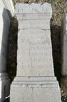 - La formule hic asquiescit dans ce contexte a été étudiée par Nicolas Laubry, « Une nouvelle inscription funéraire de Lyon : remarques sur le formulaire hic adquiescit dans l’Occident romain », Revue archéologique de l’Est, Tome 54, 2005, mis en ligne le 07 septembre 2008, consulté le 01 avril 2020. [Lire sur journals.openedition.org]