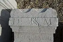 Le corpus lyonnais dispose d'un grand nombre de monuments différents[4]. Sur un grand nombre d'entre eux, le symbole de l'ascia. Il apparait lors de la deuxième moitié du IIe siècle et est utilisé rapidement sur l'ensemble des épigraphies funéraires. Très rarement gravée avec un autre outil, on la retrouve souvent entourée des lettres D et M (Dis Manibus, aux Dieux Mânes), que ce soit dans le bandeau de couronnement, au sommet du champ épigraphique ou dans le formulaire de l'épitaphe. L'identification de l'outil et sa signification funéraire restent indéterminés[20].