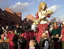 D'une hauteur de presque 4 m et pesant, environ, 75 kg[7], elle ne nécessite qu'un seul porteur ; elle est facilement identifiable par sa longe robe rouge, ornée de passementerie et d'un pourpoint blanc, avec des bijoux celtes, elle porte, sur son bras gauche, une gerbe de blé. Elle est reconnue dans le monde des géants pour être fortement compliquée à manipuler.