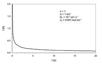 Dans le cas d'une réaction d'oxydo-réduction du type R → O + ne−, où R est le réducteur et O l'oxydant d'un couple rédox, l'équation de Cottrell s'écrit :