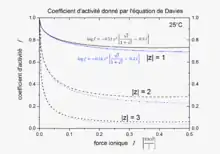 L'équation de Davies est une extension empirique de l'Équation de Debye–Hückel qui peut être utilisée pour calculer le coefficient d'activité d'une solution électrolyte de concentration relativement élevée.