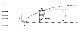 On se cantonne à l'analyse classique de Prandtl permettant l'analyse du problème de la couche limite au premier ordre. Il faut toutefois noter que l'analyse asymptotique permet d'aller au-delà[1].