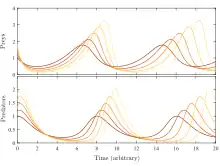 Les solutions n'ont pas d'expression simple à l'aide des fonctions trigonométriques habituelles. Néanmoins, une solution approximative linéarisée offre un mouvement harmonique simple, avec la population des prédateurs en retard de 90° (un quart de période) sur celle des proies.