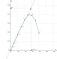 - Avant de joindre tous les points de la courbe, tracer une verticale à un angle de 57.3° (=1 radian). Tracer la valeur effective de "GM", sur l'échelle de "GZ", et tracer une horizontale passant ce point en direction de la droite. Pour finir, tracer une droite de l'origine jusqu'à l'intersection de ces deux droites. Celle-ci indiquera la tangente initiale à la courbe aux petits angles d'inclinaison, ce qui permet d'assister le tracé initial de la courbe de stabilité statique ("GZ").