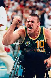 Troy Sachs célébrant debout la médaille d'or de l'Australie aux Jeux d'Atlanta - Frank Ponta a participé à 5 jeux paralympiques avec l'équipe[6]