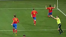 En huitième de finale, l'Espagne domine le Portugal (1-0), puis atteint pour la première fois depuis 1950 le dernier carré du Mondial en écartant en quart de finale de solides Paraguayens (1-0) au terme d'un match rocambolesque[50]. Elle retrouve l'Allemagne en demi-finale qu'elle bat sur le même score qu'en finale de l'Euro 2008 (1-0), grâce à un but de Carles Puyol.